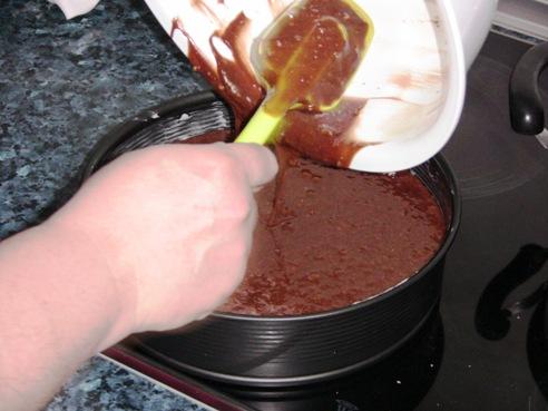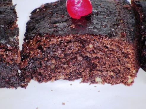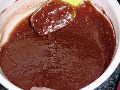 A estas alturas ya tendremos la mantequilla prácticamente líquida, le ponemos el chocolate y removemos para que se deshaga y se forme una crema homogénea, cuando está todo bién le añadimos las nueces y dejamos enfriar un poco. Mientras añadimos al huevo la harina con la levadura mezclada y lo removemos con la cuchara, mezclando y no agitando (esto me suena mucho a a James Bond jejeje) . No hace falta que esté todo muy mezclado, recordad que no quiero que se maree mucho la masa, le añadimos la mezcla de mantequilla, chocolate y nueces, terminamos de remover hasta que ya no vemos pintas de harina, lo ponemos en el molde y rápidamente al horno.