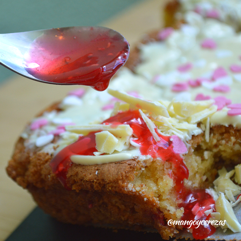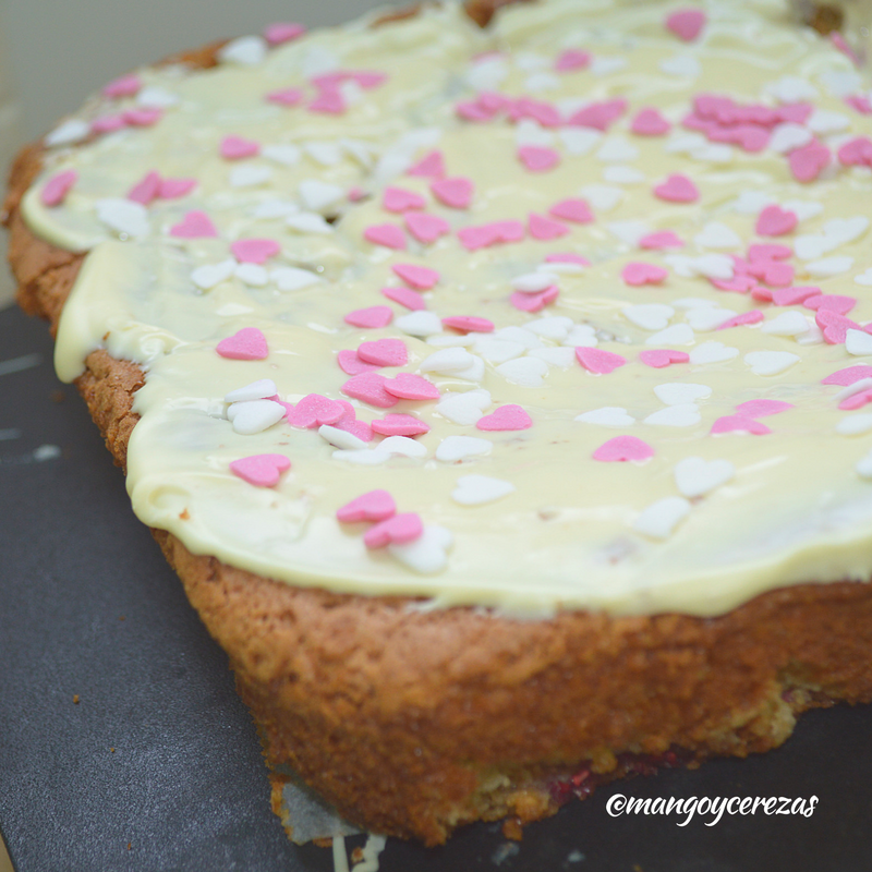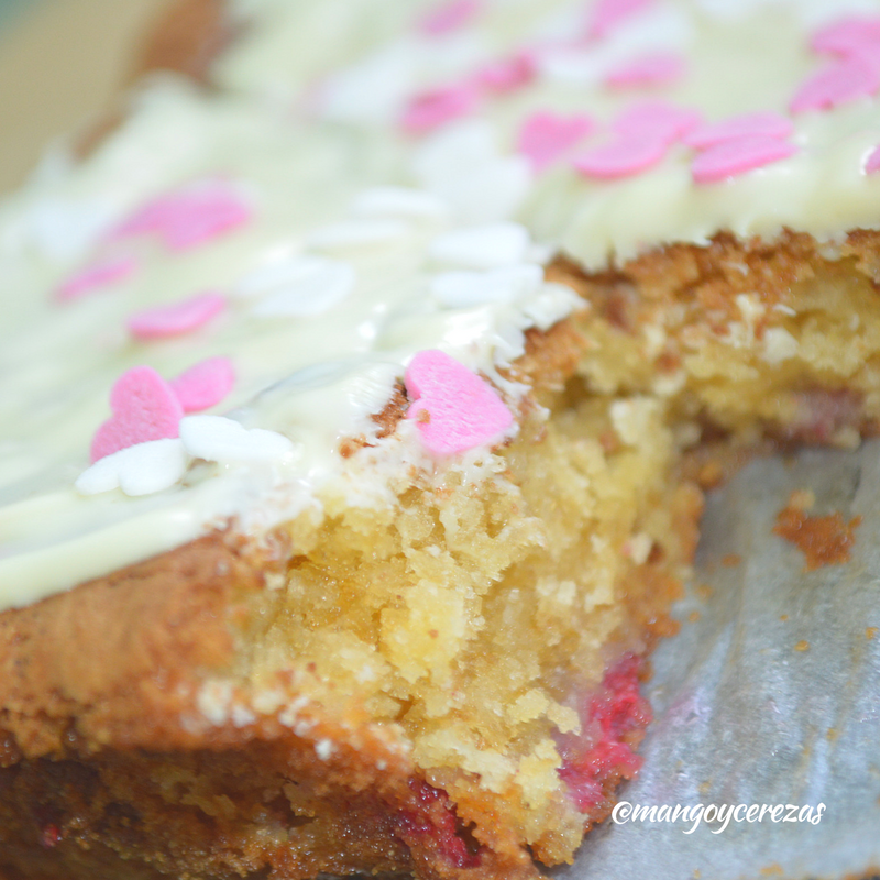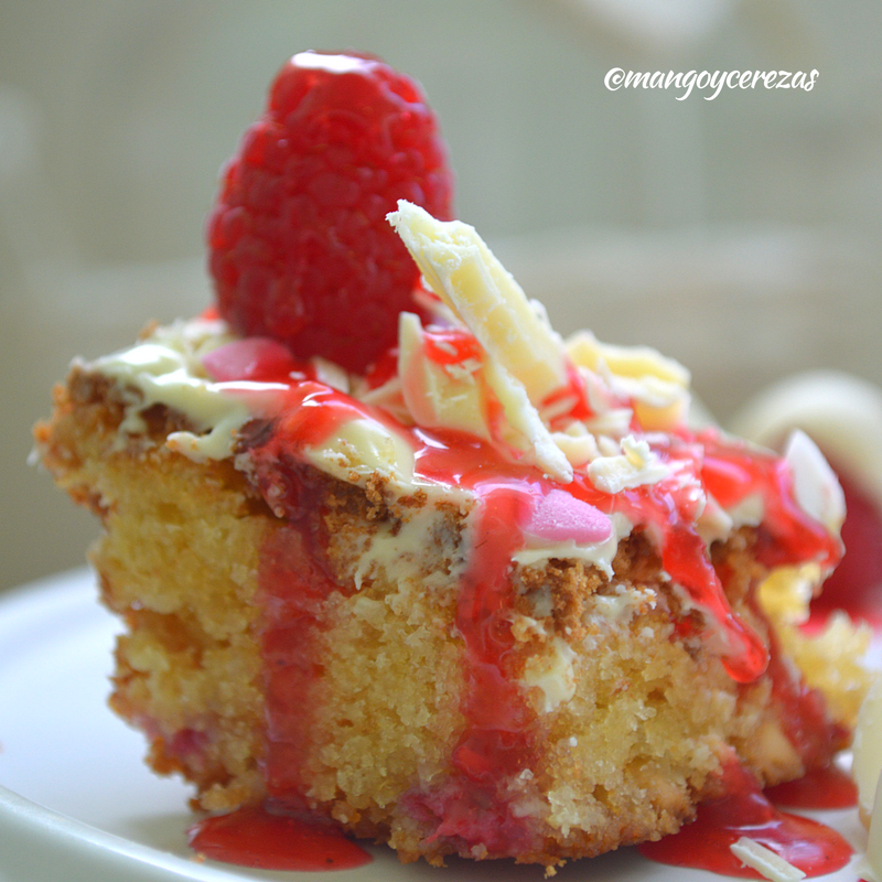 Volcar la preparación sobre un molde pereviamente engrasado y enharinado, allí podemos colocarle unas frambuesa, yo se las agregado en trozos pero no ha funcionado muy bien, pero creo que si las colocas enteras funcionara mejor.