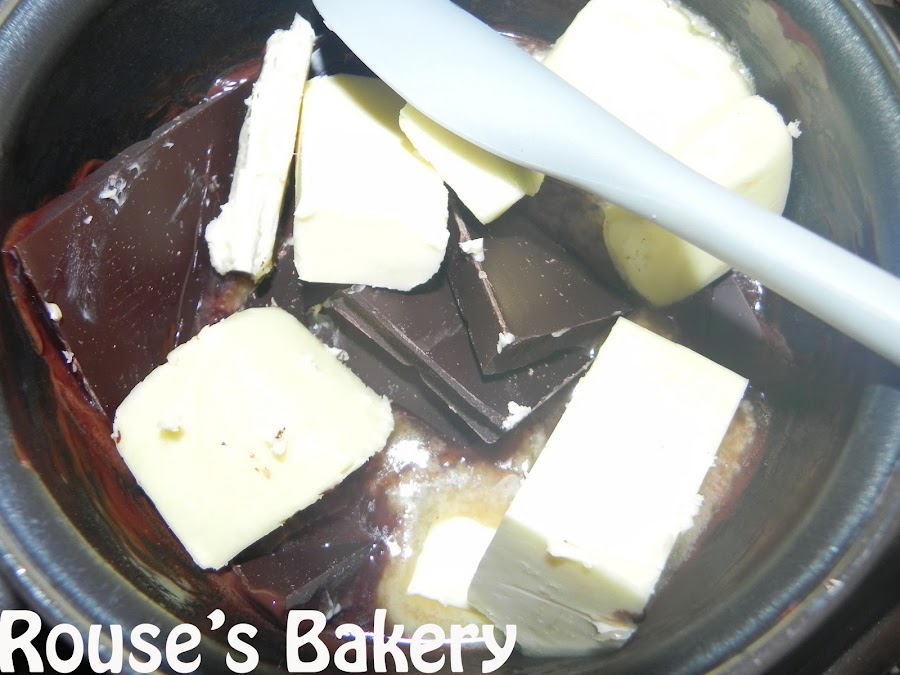 Precalentamos el horno a 170ºC. Fundimos el chocolate y la mantequilla al baño Maria. Reservamos y dejamos que se enfrie un poco.