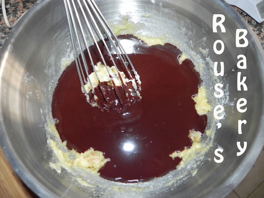 Batimos los huevos, el azúcar, la almendra molida y las nueces troceadas. Añadimos la vainilla y la mezcla de chocolate y mantequilla fundidos.