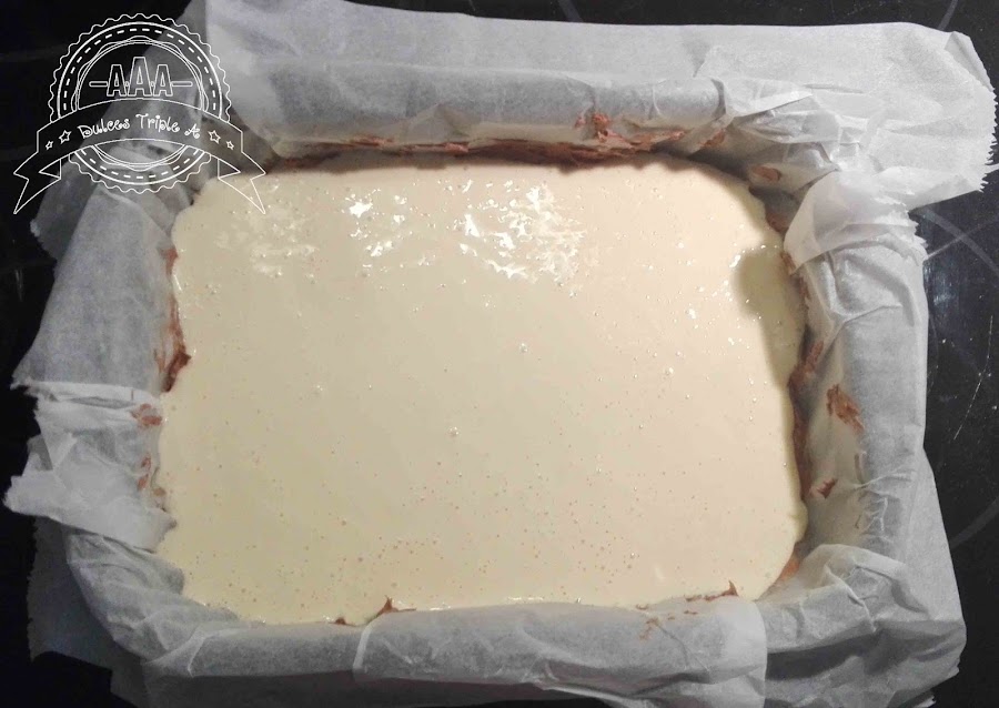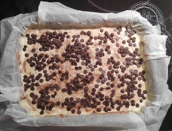 Cogemos nuestro molde que tenemos preparado con papel de hornear y vertemos la mitad de la masa del brownie, la masa es bastante consistente, así que tenéis que extenderla muy bien por todos los rincones hasta formar una capa uniforme, luego viertes la crema de queso y a continuación otra capa de masa de brownie, intenta extenderla lo mejor que puedas recuerda que es bastante consistente, no te preocupes si no consigues que quede uniforme, puedes rellenar todos los huecos con las pepitas de chocolate.