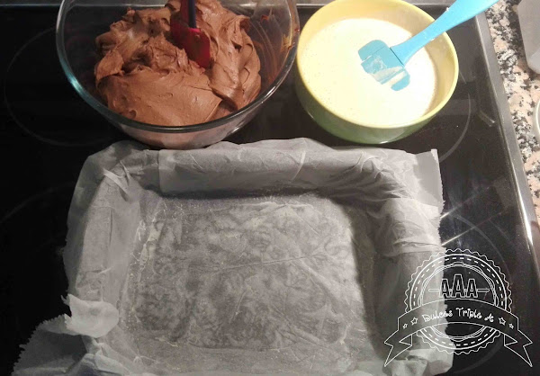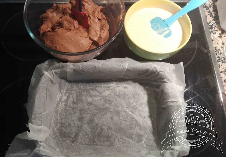 Precalentar el horno a 180ºC, calor arriba y abajo (si tu horno es de ventilación seria a 160ºc). Preparamos el molde (he utilizado uno de 24*18) cubriéndolo con papel para hornear, dejando un voladizo en todos los lados para después levantar fácilmente el brownie.