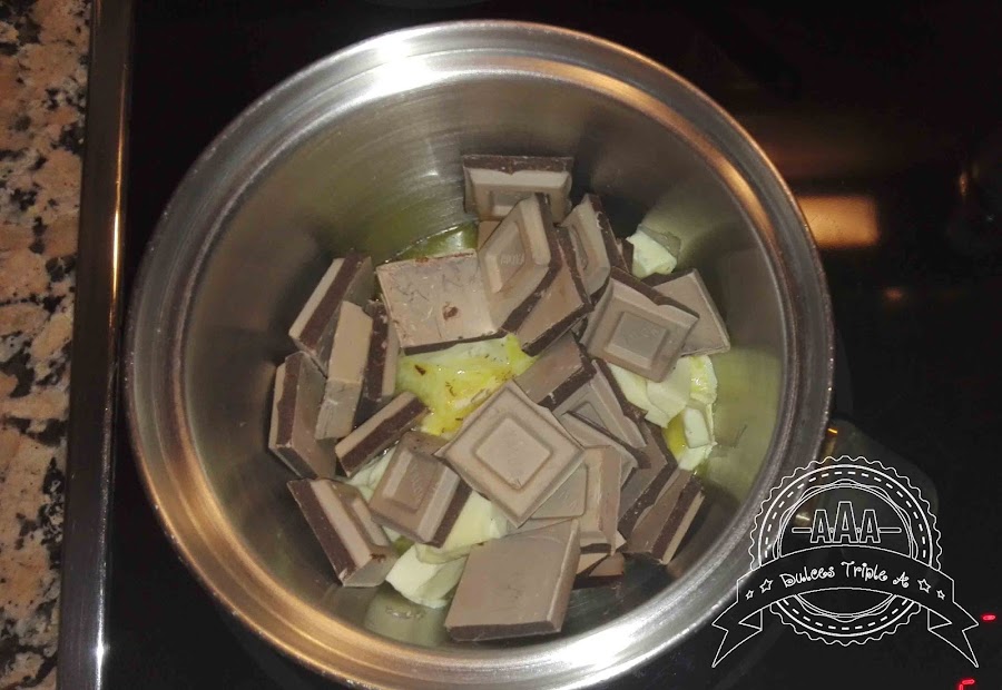 En un bol ponemos la mantequilla y el chocolate picado y derretimos a fuego medio, removiendo constantemente unos 5 minutos aproximadamente, (o derretimos en el microondas a intervalos de 20 segundos removiendo después de cada intervalo). Retirar del fuego, verter en otro recipiente y dejar enfriar un poco, aproximadamente unos 10 minutos.