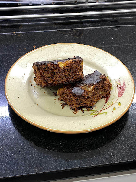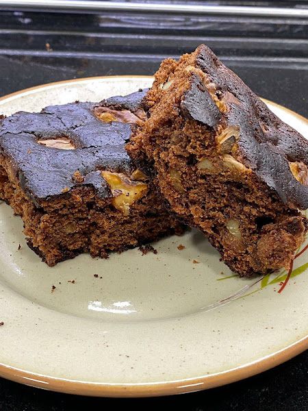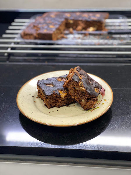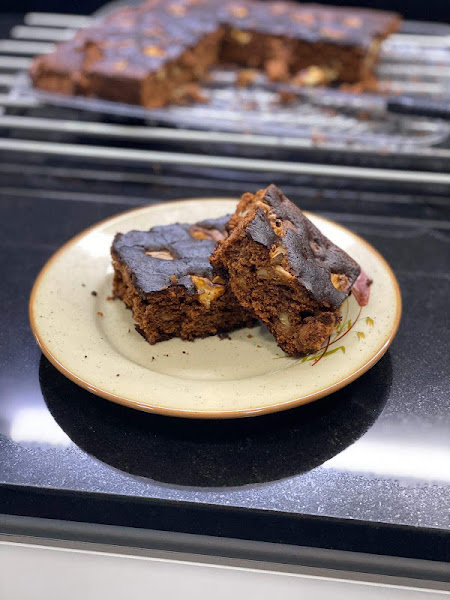 Me invitaron a comer, para merendar pude degustar éste delicioso y esponjoso brownie con nueces, el chocolate es un vicio para mí, por supuesto que no me podía negarme a probarlo.