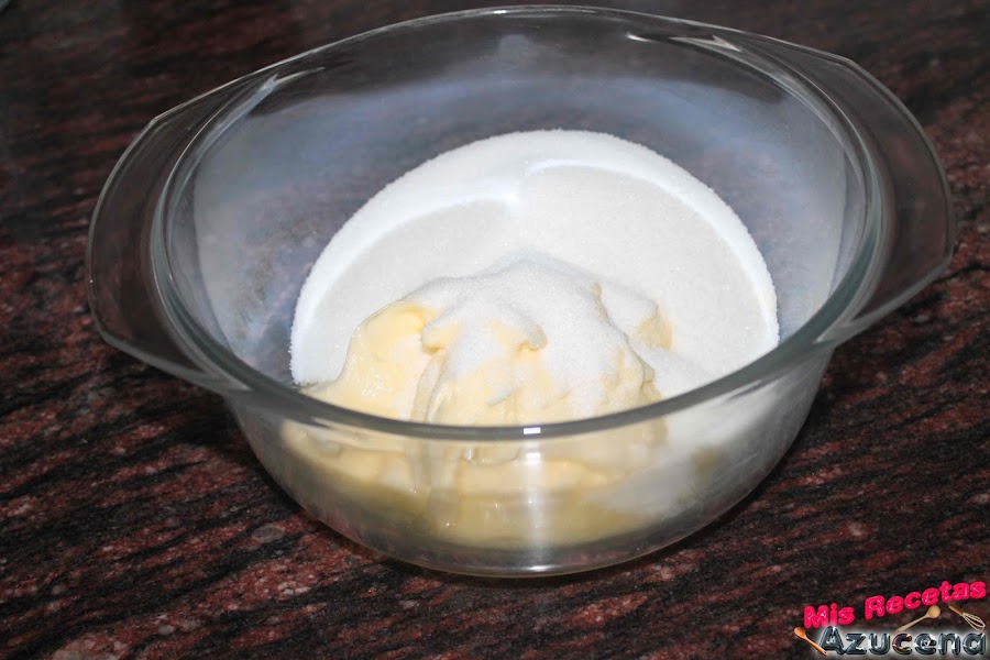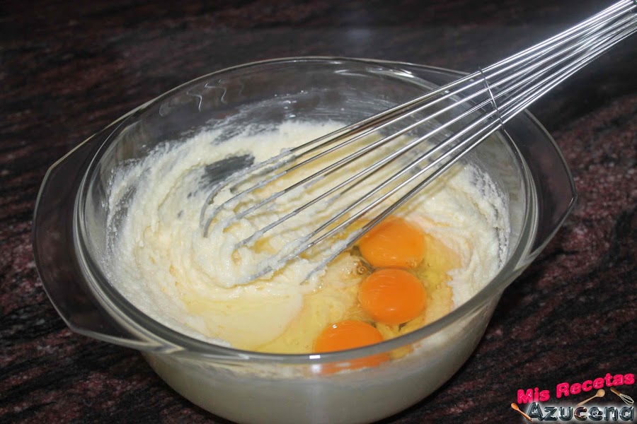 Ahora prepararemos el bizcocho, ponemos en un bol la mantequilla junto con el azúcar, con ayuda de unas varillas mezclaremos bien hasta que blanqueen, en ese momento añadiremos los huevos, volvemos a mezclar bien.