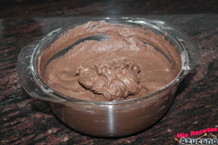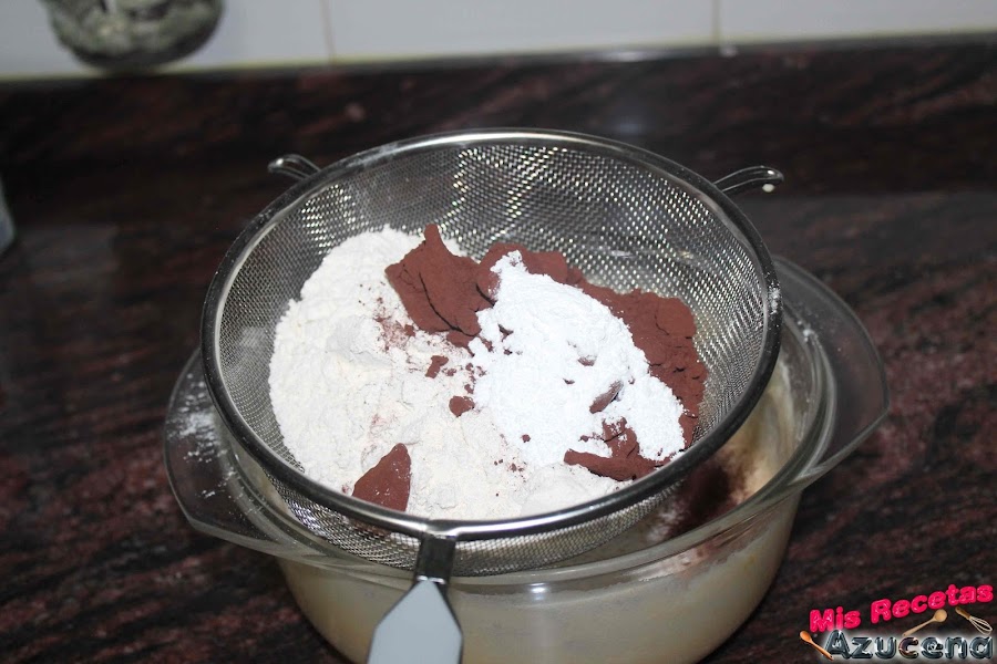 Sobre el bol y con ayuda de un colador tamizaremos la harina, el cacao y la levadura, volvemos a mezclar todo bien.