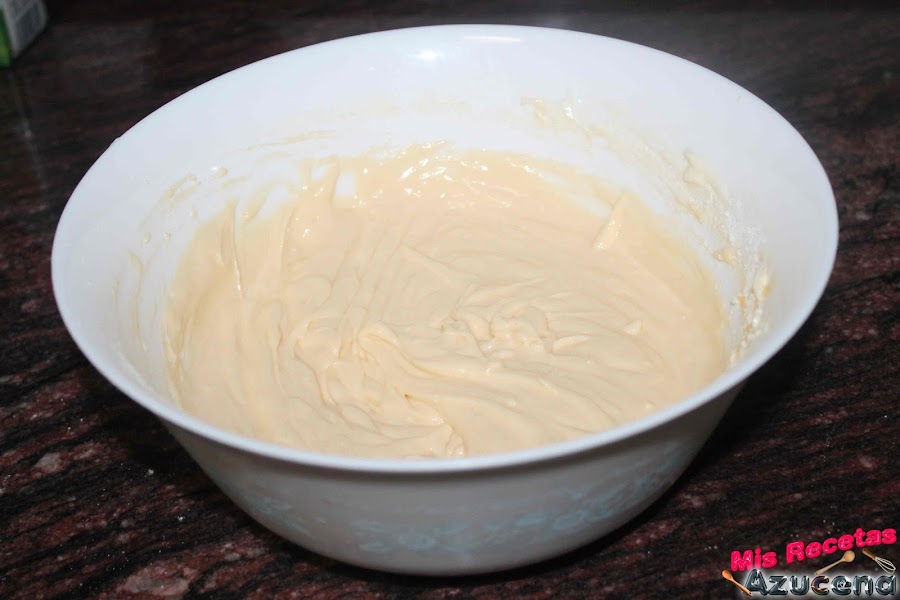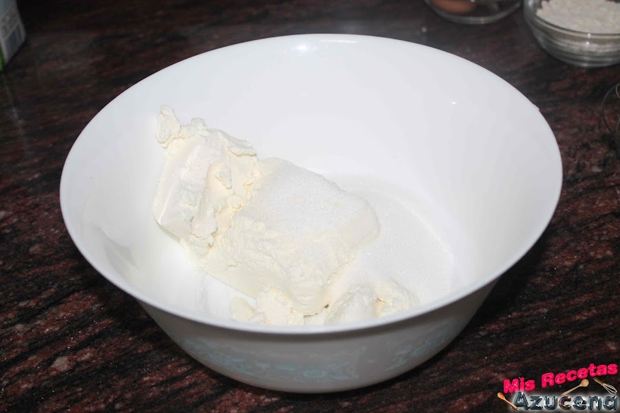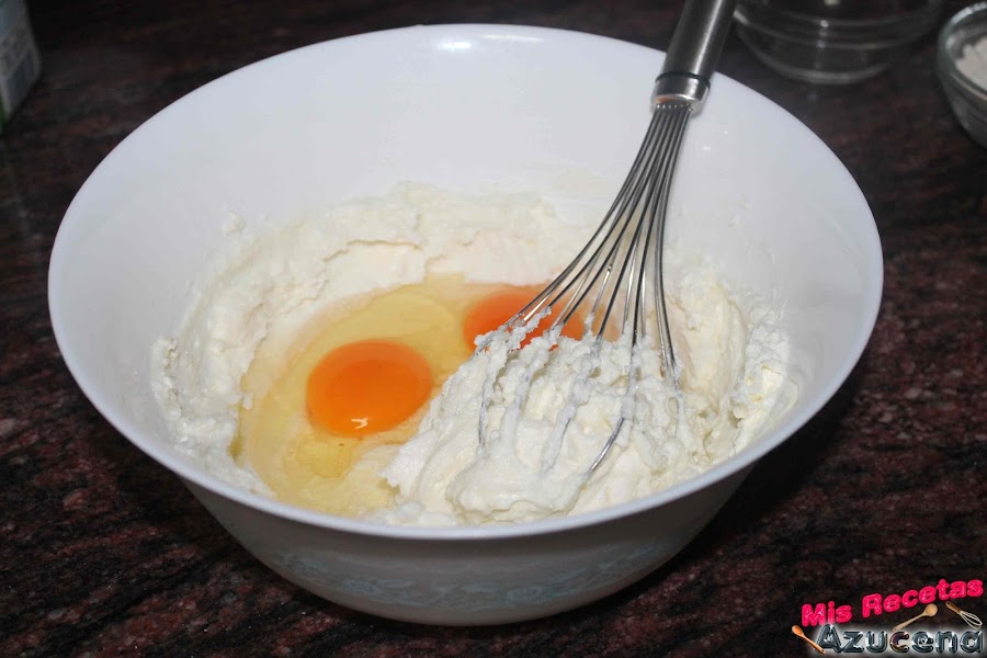 Lo primero que prepararemos de esta receta será el cheesecake, para ello cogemos un bol y ponemos el queso junto con el azúcar, con ayuda de unas varillas mezclaremos bien hasta que el azúcar se mezcle con el queso, en ese momento añadiremos los huevos y seguiremos mezclando con ayuda de las varillas hasta que queden bien integrados todos los ingredientes.