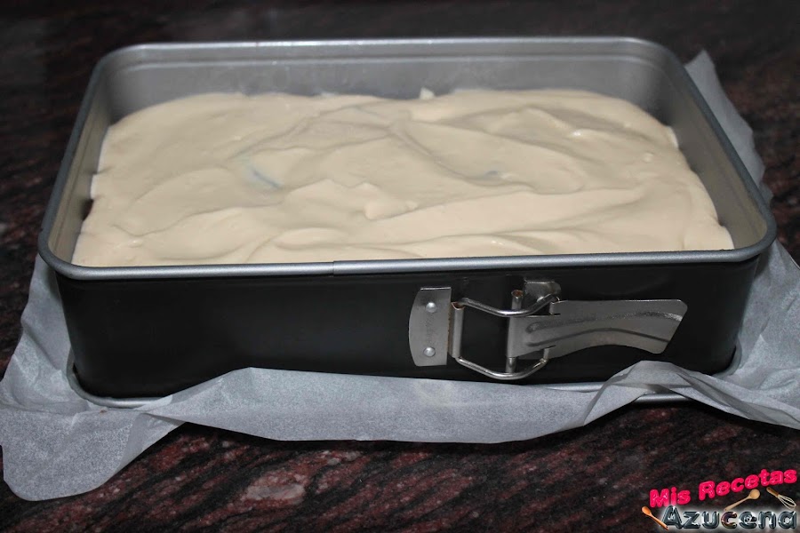 Cogemos nuestro molde y le pondremos papel vegetal en la base y spray desmoldante por los lados, si no tenemos spray lo podemos hacer como siempre untando mantequilla y espolvoreando un poco de harina, el molde que yo he utilizado es de 28x19.