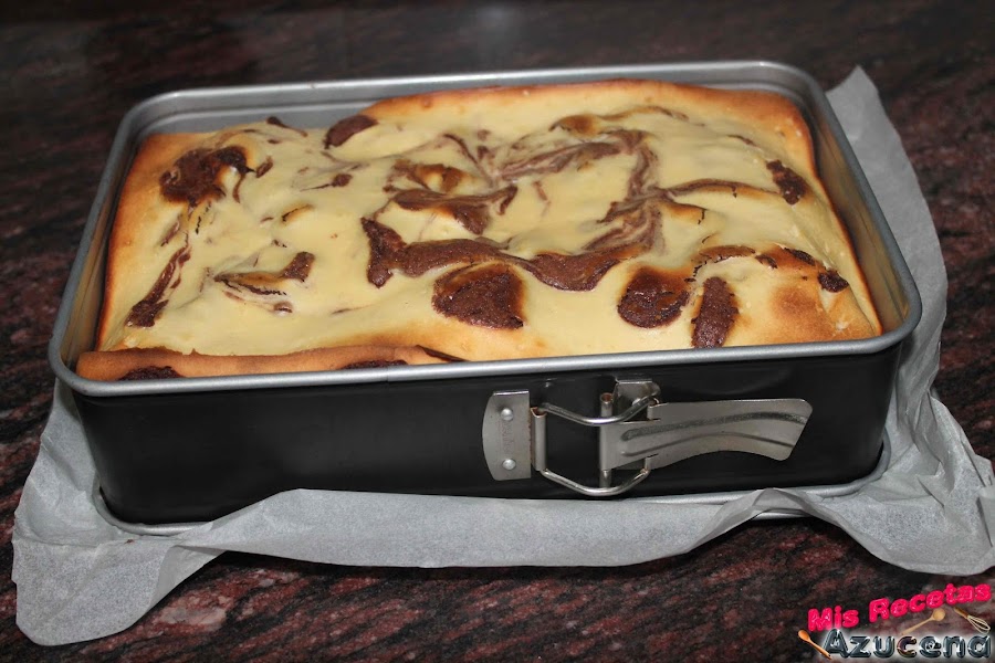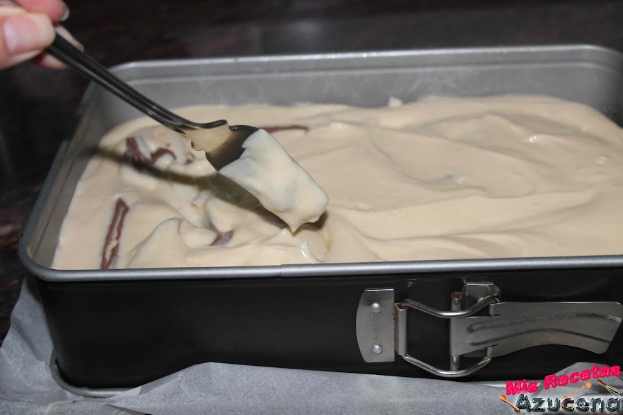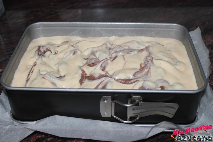 Con ayuda de un tenedor mezclaremos un poco las masas, una vez esté a nuestro gusto, meteremos el molde en el horno y lo dejaremos durante 45 minutos.