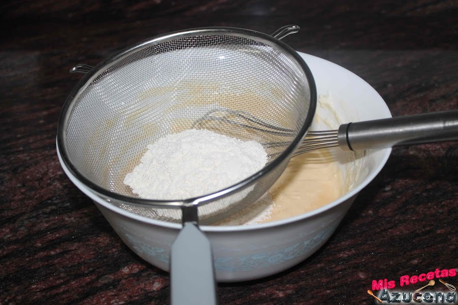 Con ayuda de un colador tamizaremos la harina sobre el bol, volvemos a mezclar para que la harina se mezcle bien, y por ultimo añadimos el extracto de vainilla, mezclamos un poco más todo el contenido del bol y reservamos.