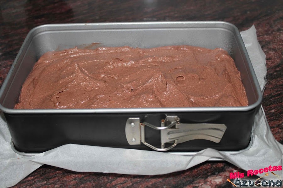 Ahora haremos las capas, la primera capara será la de bizcocho de chocolate y encima pondremos la de queso.