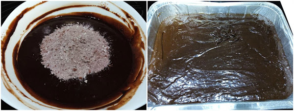Precalentamos el horno a 190º. Añadimos poco a poco la harina mezclada con el cacao en polvo y la sal. Removemos todo hasta que esté bien integrado y pasamos a una bandeja apta para horno previamente engrasada.
