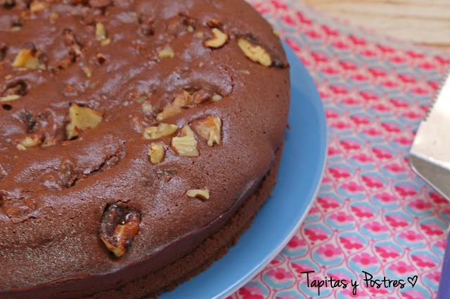 Añadimos las nueces troceadas y mezclamos con una espátula. Vertemos en un molde desmoldable engrasado y horneamos unos 35 minutos a 180º. Comprobamos si está hecho pinchando con un palillo. Debe salir algo húmeda.