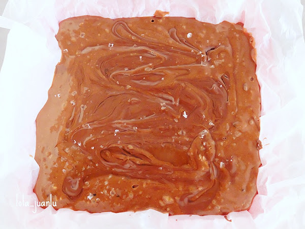 Introducimos la masa en el molde que tenemos preparado y la extendemos bien. Añadimos la Nocilla restante en pequeñas porciones y la extendemos por todo el brownie con un untador formando dibujos. Añadimos unas escamas de sal para potenciar más el sabor.