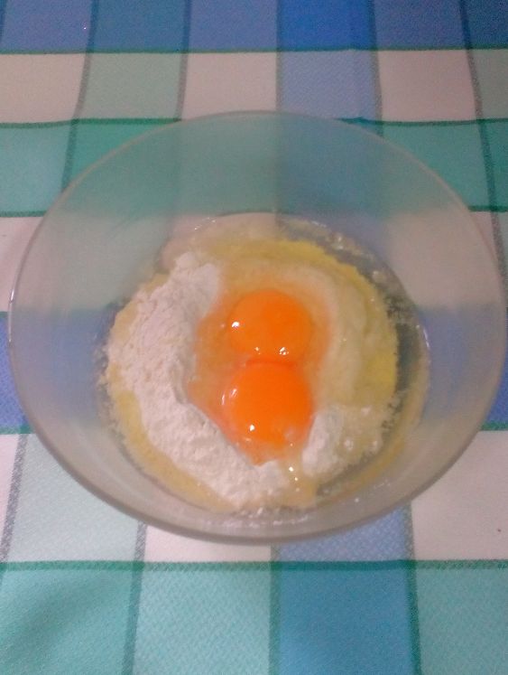 En un recipiente añadimos el harina, los huevos y mezclamos