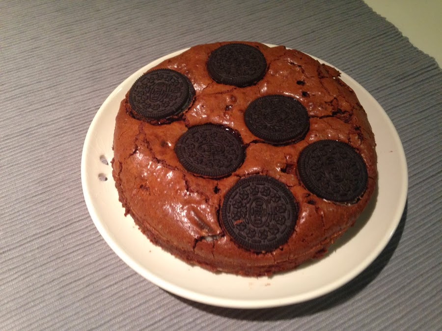 5. ¡Ya casi estamos! Introducimos la mezcla en el molde engrasado, añadimos algunas galletas oreo por encima para decorar y lo metemos en el horno unos 30-40 minutos (el tiempo de cocción varía dependiendo de cada horno. Podrás comprobar si ya está listo introduciendo un palillo. Ten en cuenta que en este tipo de Brownies la masa ha de quedar un tanto cruda).