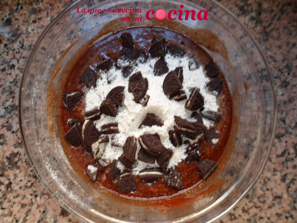Echamos la harina y las galletas troceadas en la mezcla del bol y removemos muy bien para que la harina quede totalmente integrada. Para ello usaremos movimientos envolventes de arriba a abajo.