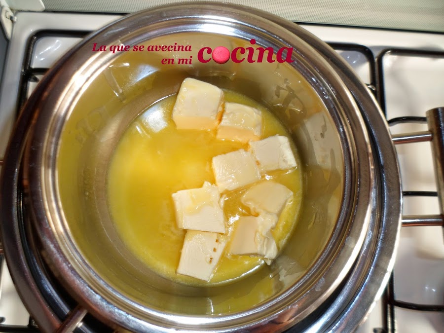 Comenzaremos poniendo en un cazo la mantequilla a derretir. Acto seguido, cuando esté totalmente líquida le añadiremos el chocolate partido (para que se de funda más rápido) y lo iremos removiendo todo.