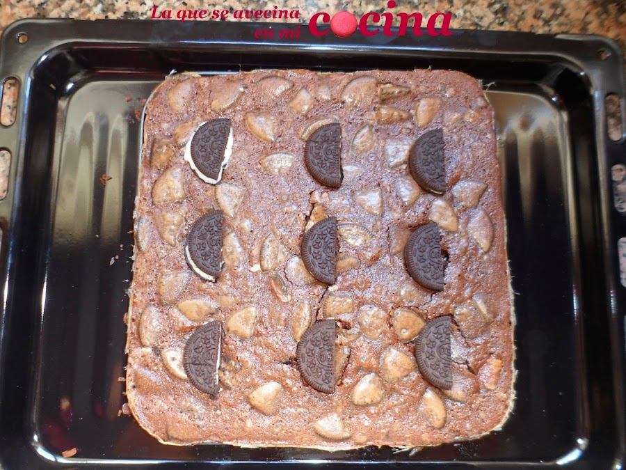 Para decorar le he puesto algunos trozos de galletas encima aún cuando el brownie estaba caliente para que se puedan "incrustar" en el bizcocho.