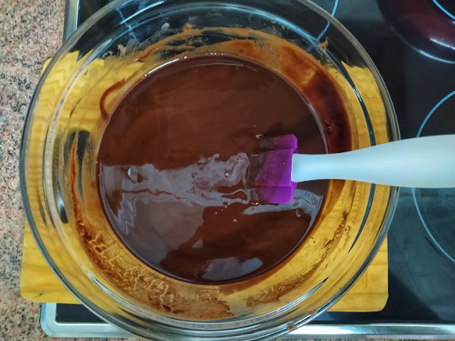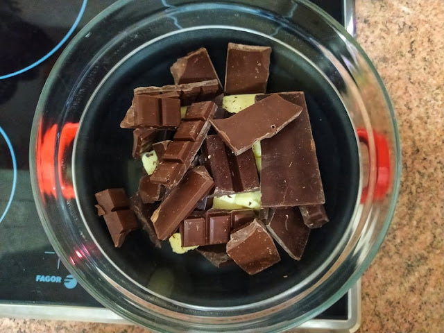 Lo primero que vamos a hacer es derretir el chocolate (ambos) con la mantequilla al baño maría o al microondas, si lo hacéis al microondas os recomiendo hacerlo en intervalos de pocos segundos porque se os puede quemar muy fácil el chocolate, por eso suelo optar por la primera opción (al baño maría). En esta receta no necesitamos que la mantequilla esté a temperatura ambiente, la puedes sacar de la nevera justo en el momento de usarla.
