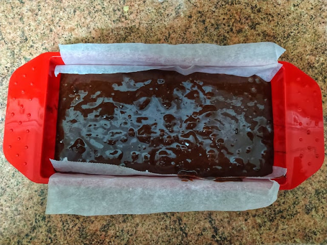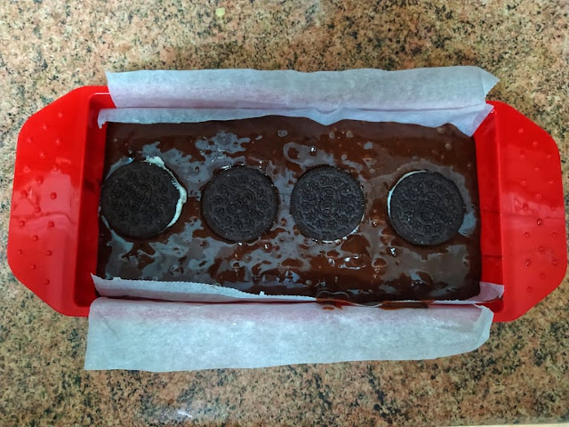 En un bol de silicona rectangular, colocamos papel de hornear para que después nos sea más fácil desmoldar, podéis recortarlo para que os encaje pero dejando algo sobrante para sacar hacia arriba nuestro brownie cuando esté hecho. Añadimos la masa y colocamos unas galletas oreo por encima para decorar.