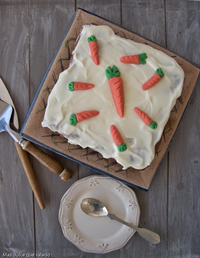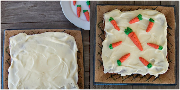 Cubrimos el brownie y decoramos con las zanahorias de fondant.