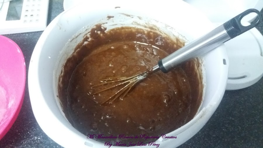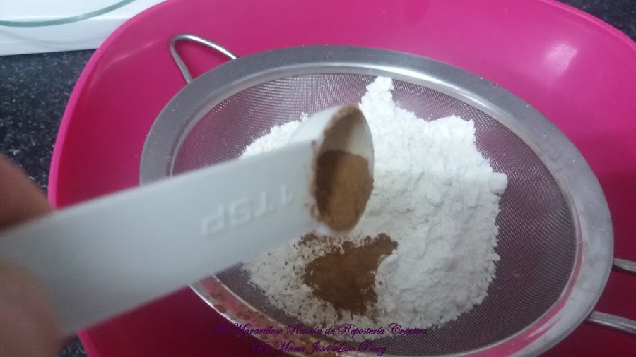 En un colador tamizamos juntas la canela y la harina, que añadimos a la mezcla de chocolate.