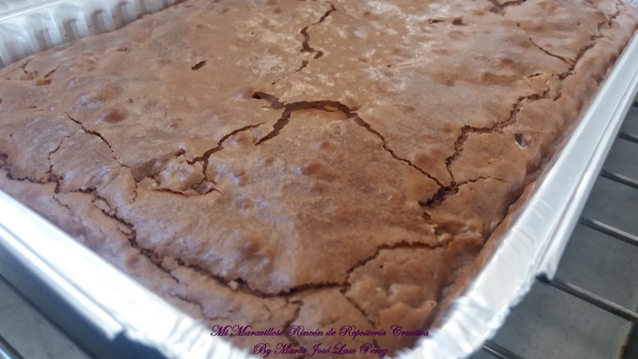 Engrasamos un molde (yo utilicé uno de aluminio desechable de 31cm x 20 cm) y vertemos en él la masa. Lo metemos al horno de 20 a 25 minutos (debéis vigilarlo, pues cada horno es diferente). Cuando pinchéis con una brocheta de madera el centro del brownie y el palillo salga limpio, ya está hecho.