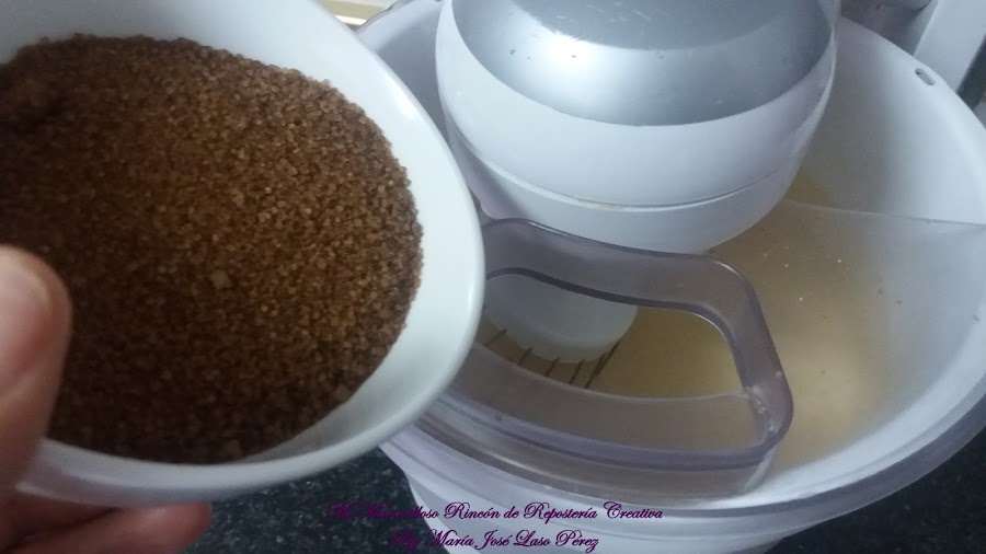 En el bol de la batidora eléctrica, ponemos a batir los huevos, la pizca de sal y el azúcar moreno. Dejaremos batiendo a velocidad media hasta que la mezcla doble su volumen y el azúcar se haya disuelto.