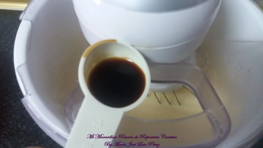 Añadimos el extracto de vainilla, sin dejar de batir. A continuación echamos el chocolate en los huevos y mezclamos de forma manual con las varillas manuales hasta que se haya integrado bien todo,