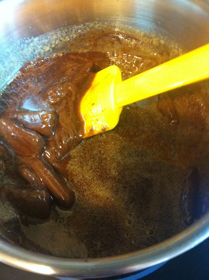 Se aparta el cazo del fuego y se agrega la mantequilla en dados, removiendo. Si no disponéis de mantequilla salada se puede usar sin sal y añadir un pellizco de sal. A continuación se agrega el chocolate y la vainilla.