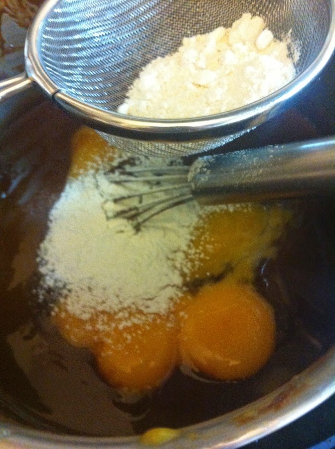 Se baten a punto de nieve las claras y las yemas se mezclan con el contenido del bol y con la harina tamizada.