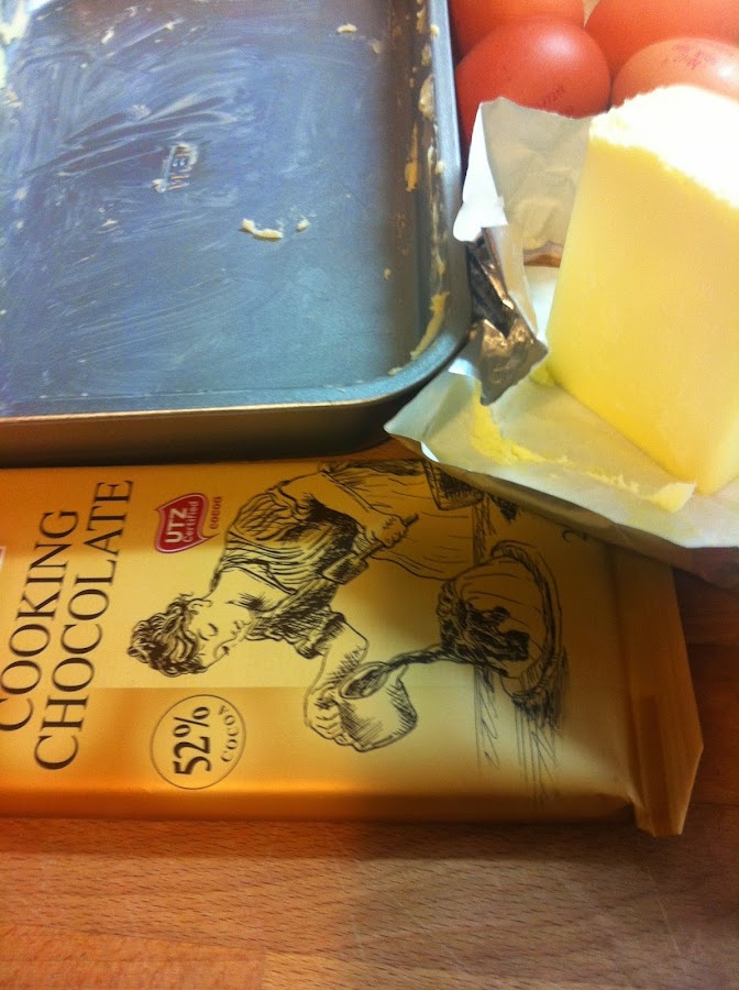 azúcar morena para espolvorearSe precalienta el horno a 180º con calor arriba y abajo. Se unta un molde rectangular (o redondo) con mantequilla y se espolvorea con un poco de harina. Se reserva.