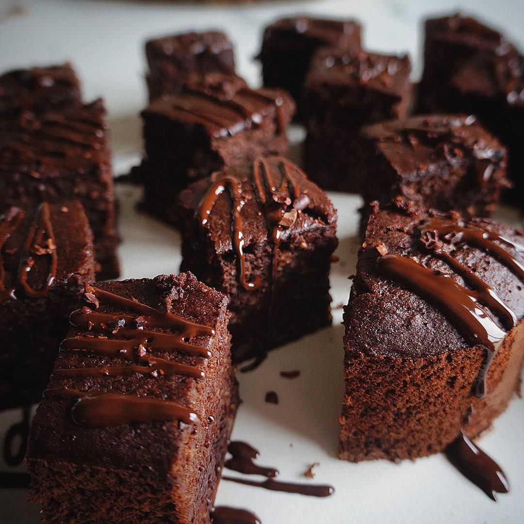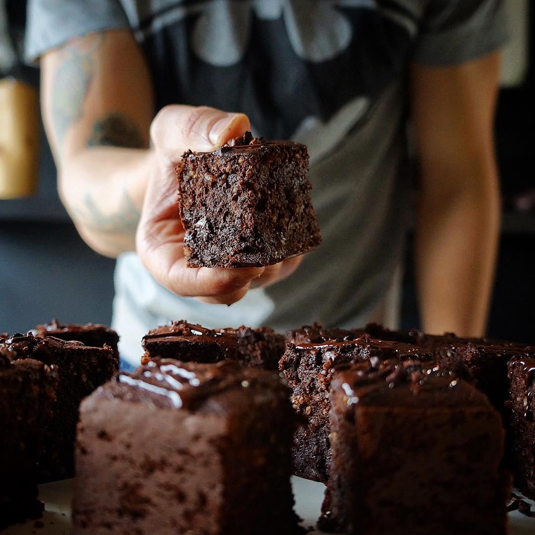 Una vez horneado, desmolda, corta el brownie en cuadrados, reparte el chocolate fundido y espolvorea los nibs de cacao por encima.