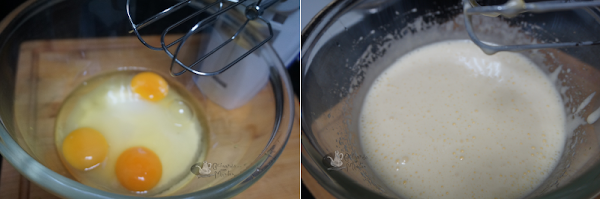 En otro bol poner los huevos y el azúcar, bate con unas varillas hasta que aumenten y quede una masa un poco blanquecina.