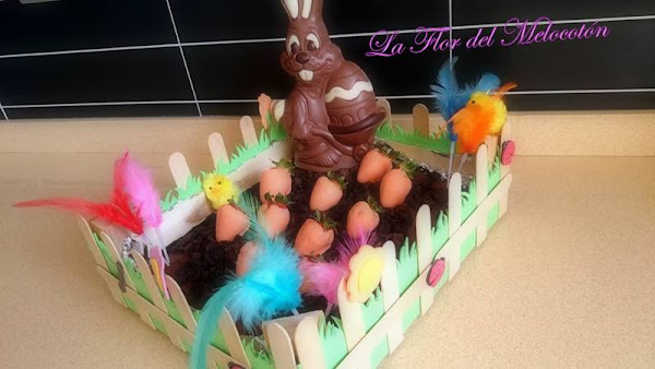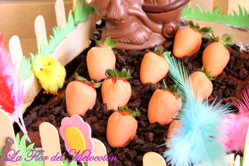 Troceamos las galletas oreo y las ponemos por encima del brownie, colocamos las fresas de manera que parezca un huerto de zanahorias, y por último la figura de chocolate con forma de conejo.