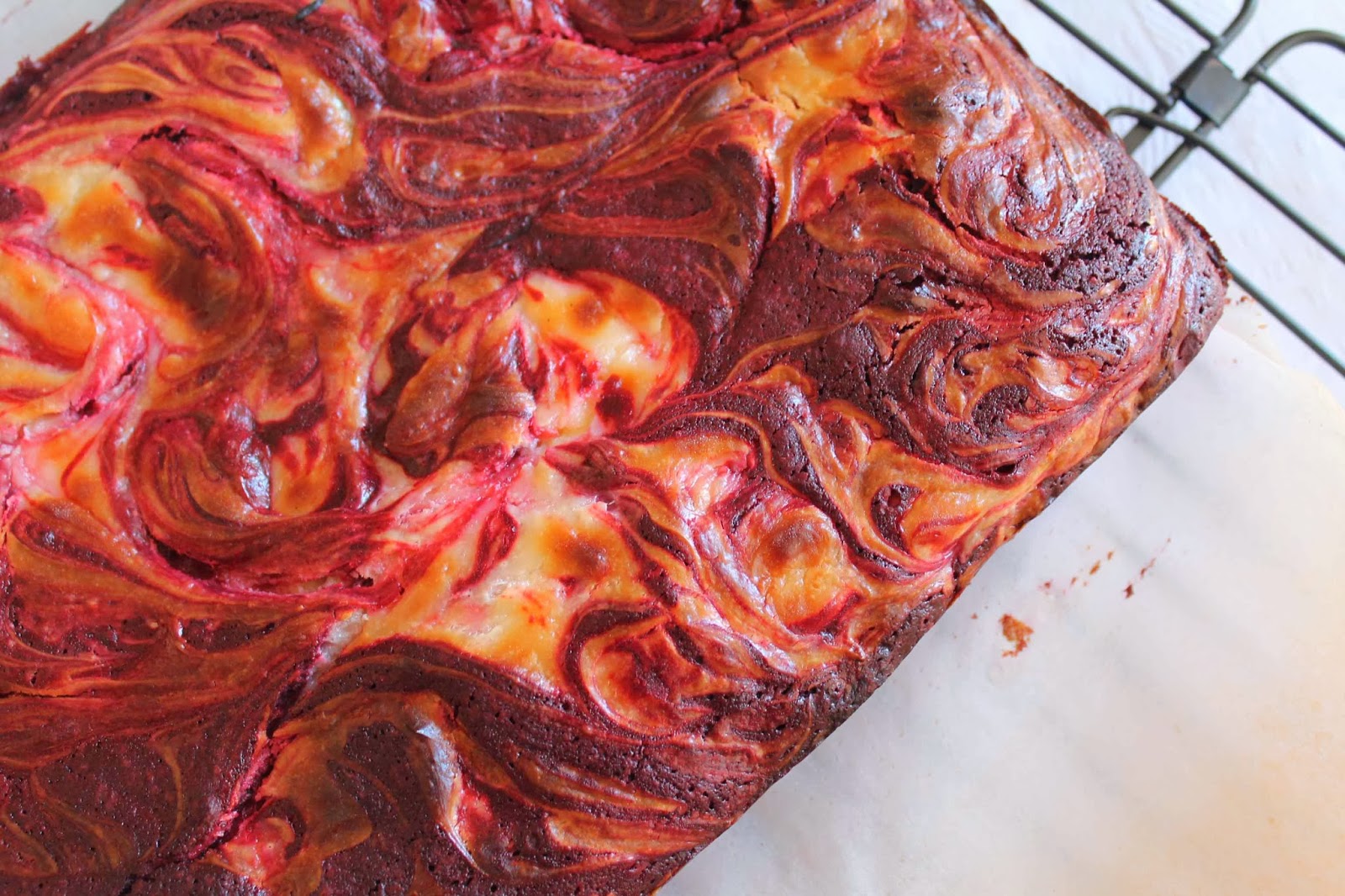 Combina el chocolate rojizo, por el colorante, con la suavidad de la crema de queso. Se prepara en dos fases, por un lado, la base del brownie y por otro la crema de queso.