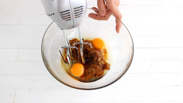 3º En otro recipiente batiremos los huevos con el puré de manzana y el extracto de vainilla