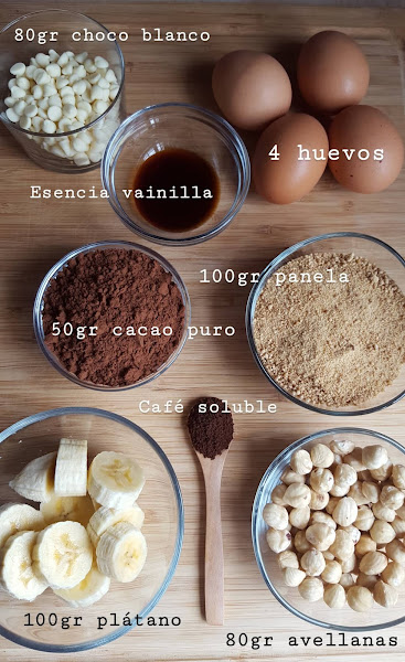 2. Con la ayuda de un robot de cocina mezclamos el plátano, el cacao, la panela, los huevos, la vainilla y el café hasta conseguir una mezcla homogénea.