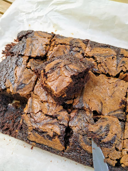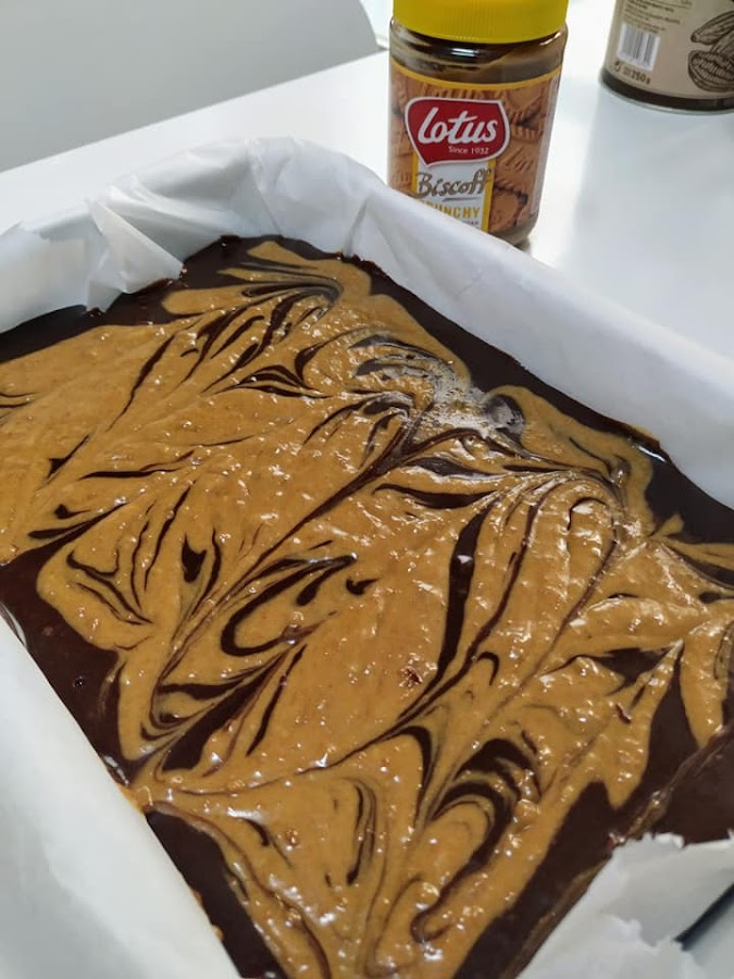 Preparamos una bandeja forrada con papel vegetal y vertemos la masa, ya tendríamos nuestro brownie de chocolate listo para hornear pero si le queréis dar un toque diferente cogemos 3 cucharadas soperas de crema Lotus y las mezclamos con un poco de bebida vegetal de avena, vertemos por encima de la masa y con un cuchillo hacemos como un zig zag por encima.