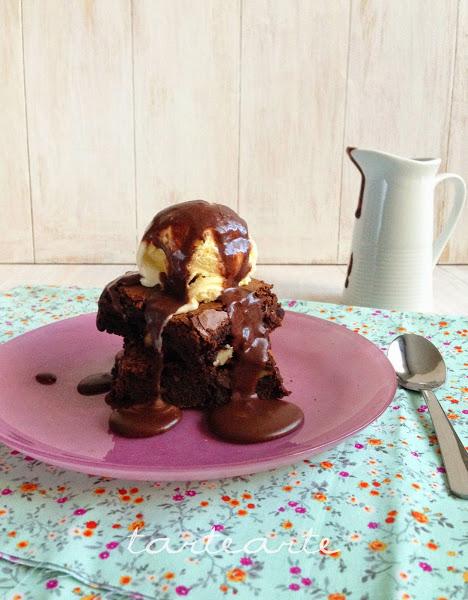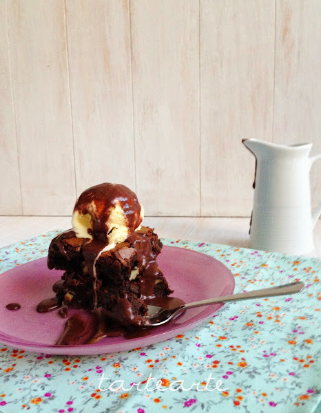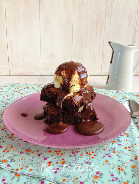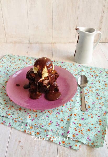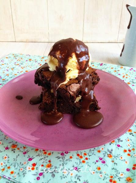 Sacamos del horno y lo dejamos enfriar 10 minutos, lo cortamos en cuadrados, ponemos una bola de helado de vainilla y sirope de chocolate por encima y a disfrutar!!! jejeje