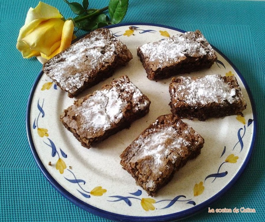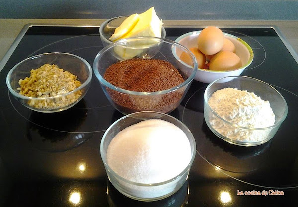 En un cuenco poner los huevos con el azúcar, batir durante unos minutos hasta que doble su volumen, añadir la mantequilla derretida y el chocolate, batir bien, incorporar la harina con la levadura, batimos y por último incorporamos las nueces troceadas.