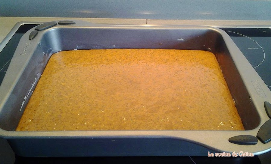 Mezclamos bien con una espátula hasta que la mezcla quede homogénea. Engrasar un molde de poca altura con mantequilla, verter en él la mezcla y meterlo al horno durante 20, 25 minutos aproximadamente.