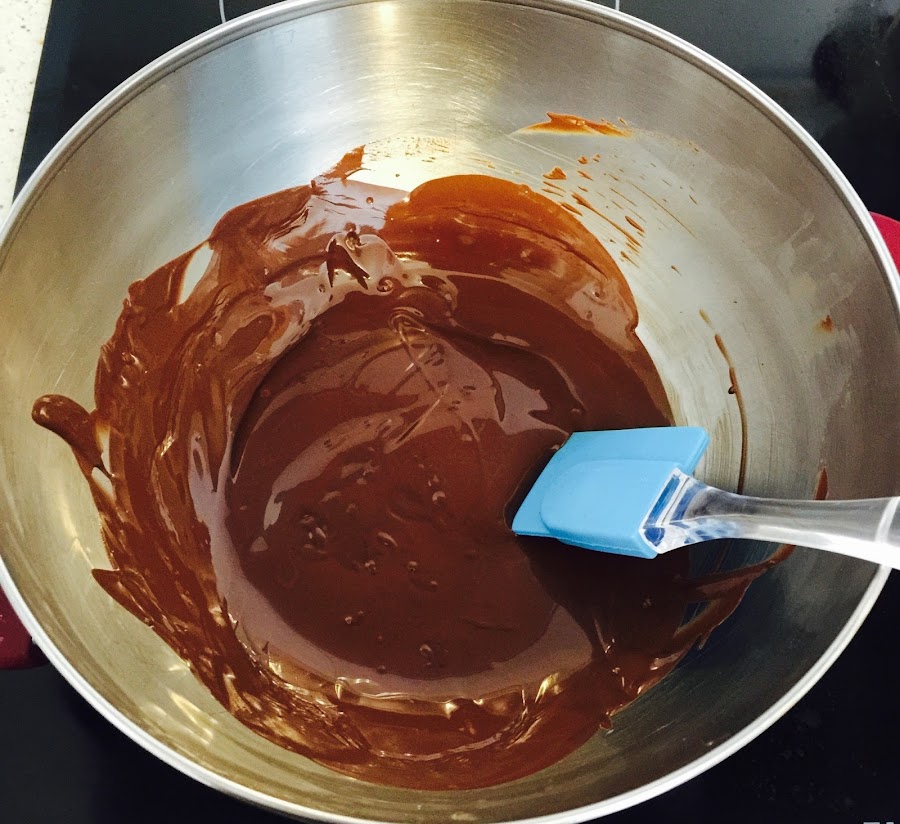 A baño Maria, ponemos una cacerola con agua y un bowl arriba, que el agua a penas toque el recipiente de arriba. Muy importante que el agua no hierva, por que se quema el chocolate y queda con un sabor muy fuerte y amargo. Una vez que el chocolate esta casi todo derretido le agregamos la manteca para que se derrita tambien, y lo sacamos del fuego y lo dejamos templar un ratito mientras hacemos la masa.