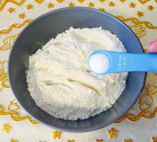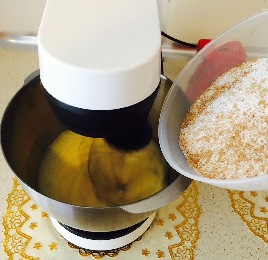 Con batidora y hasta que queden espumosos, para que quede mas como bizcocho. A continuación le vamos a agregar una cucharadita de sal a la harina y la mezclamos.
