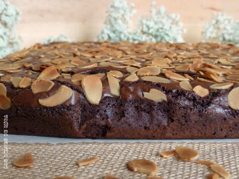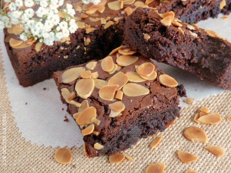 El brownie original es de chocolate con nueces y sin levadura pero eso no quiere decir que no se puedan utilizar otros ingredientes como pistachos, avellanas, almendras como en este caso, o incluso chocolate blanco.
