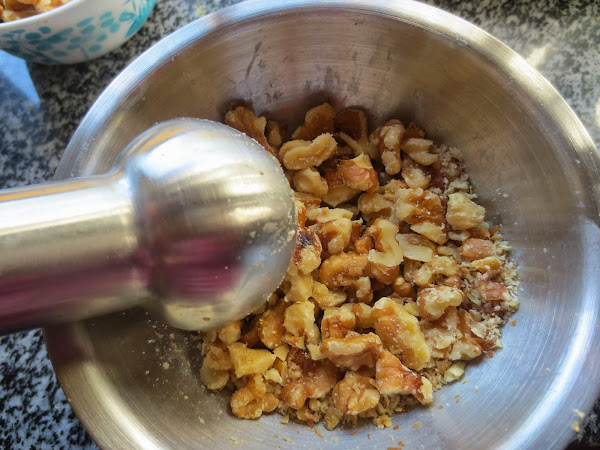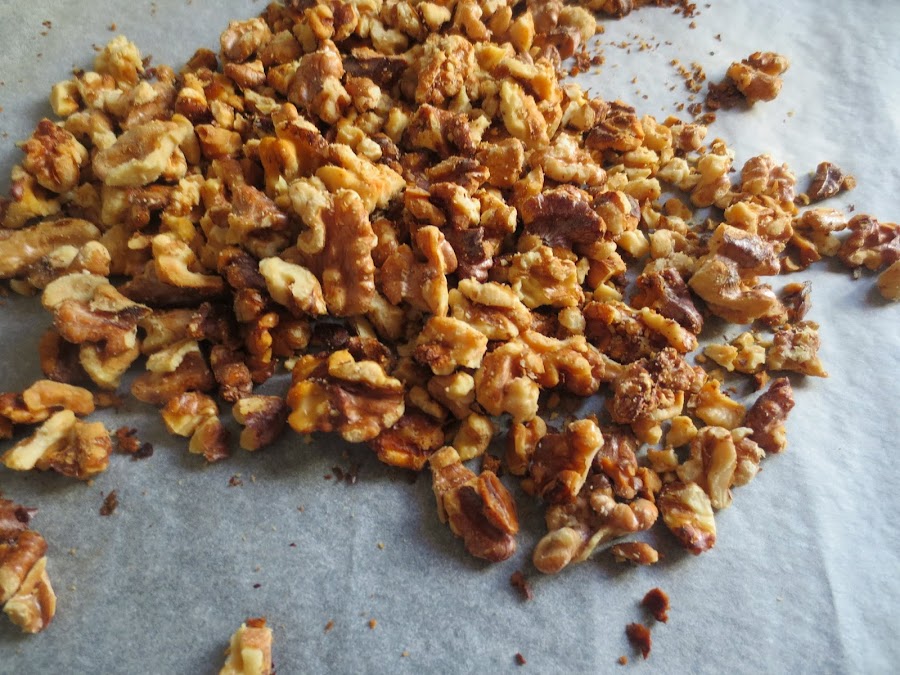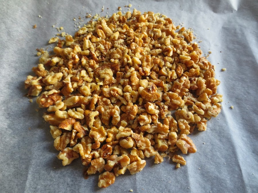 1- Precalentar el horno a 200º. Romper las nueces que queden trozos, con un mortero o en una bolsa pasando el rodillo. Hornear unos 10 minutos, así potenciamos el sabor del fruto seco, ésto es opcional eh?? Bajar el horno a 180º.