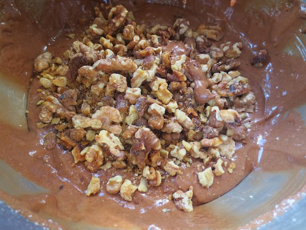 5- Ir echando la harina con la Ka en marcha en velocidad 1. Agregar las nueces y mezclar 5 segundos en velocidad 1.