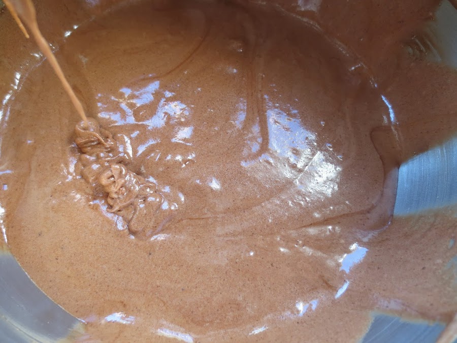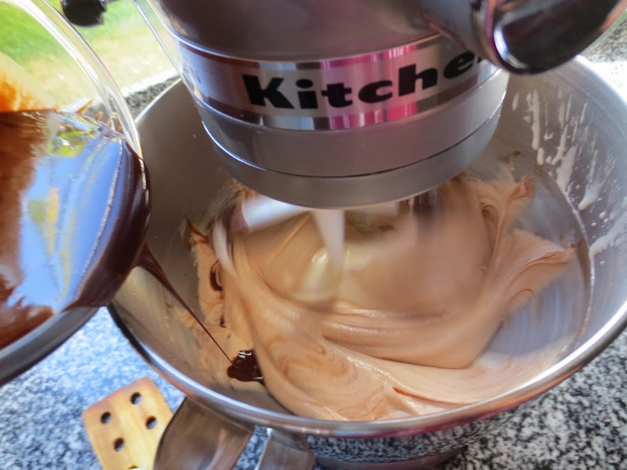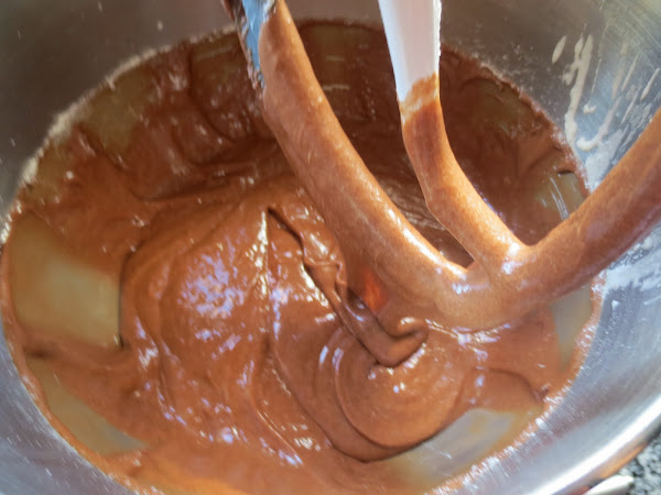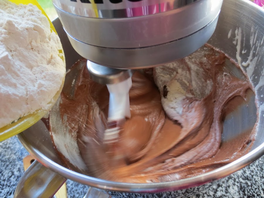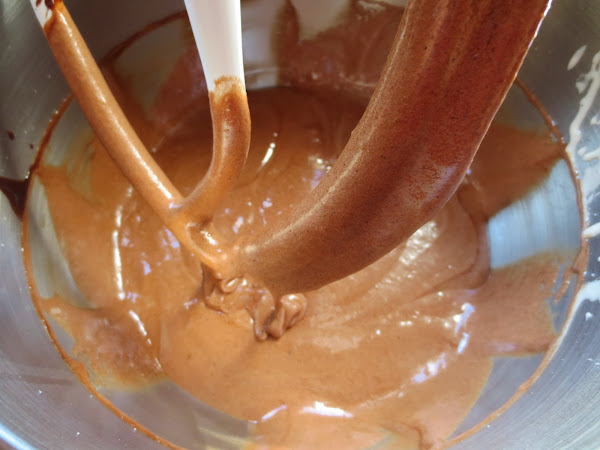 4- Cambiar la varilla por la pala mezcladora y añadir el chocolate fundido con la KA en marcha en velocidad 1.