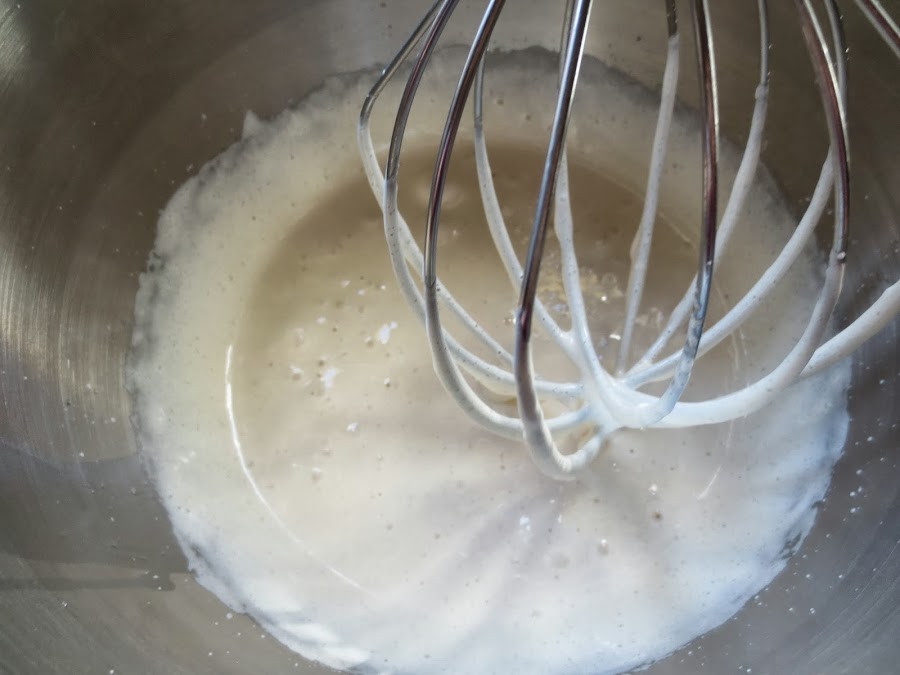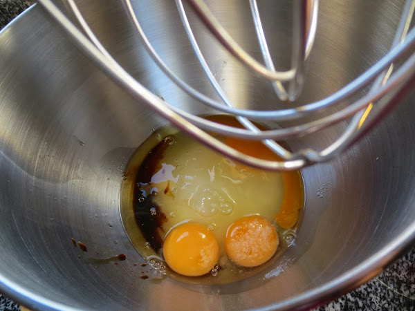 3- Colocar la varilla y blanquear los huevos, azúcar , sal y vainilla, a velocidad máxima unos 2 minutos, hasta que espumen.